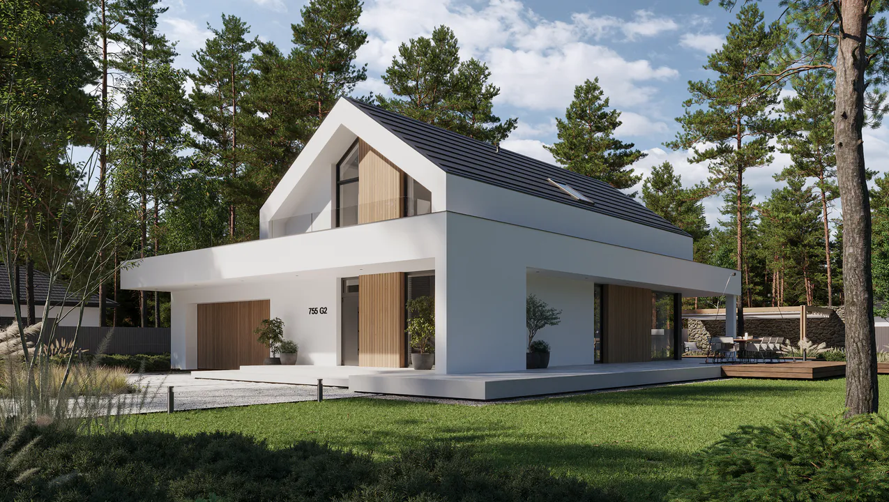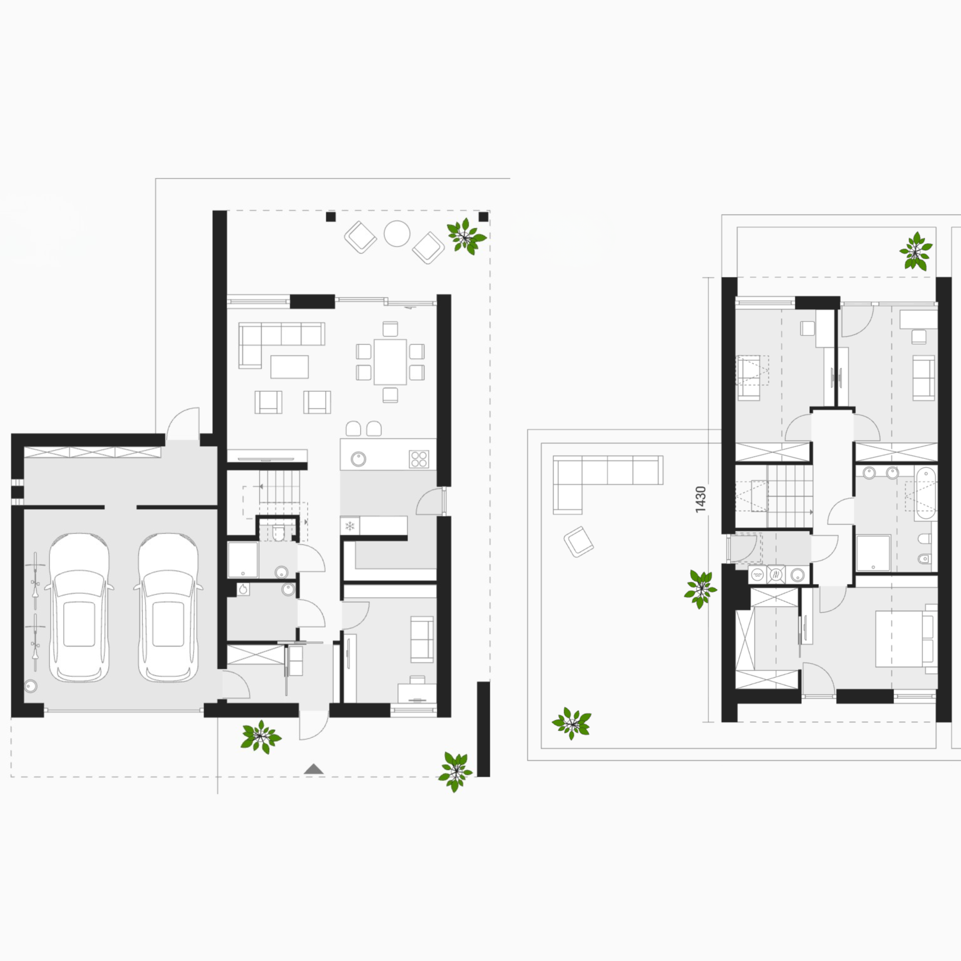 A kazánház külön helyiségben kapott helyet, így a gépészeti elemek elkülönülnek a lakótértől. A dupla garázs közel ötven négyzetméteres területe biztonságos parkolást és praktikus tárolási lehetőségeket kínál. A Stockholm 3 tiszta, funkcionális alaprajza jól illeszkedik a modern életvitelhez, miközben hosszú távon is stabil alapot biztosít.